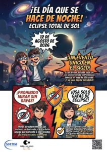Recuerda: ¡PROHIBIDO MIRAR SIN GAFAS DE ECLIPSE! Mirar directamente al Sol, incluso por un instante, causa daño ocular permanente e irreversible. La única protección segura para la observación son las gafas de eclipse certificadas que cumplen estrictamente con la norma ISO 12312-2. NO SIRVEN gafas de sol, radiografías, CDs, cristales de soldador ni otros métodos caseros.